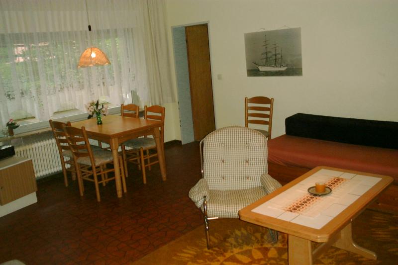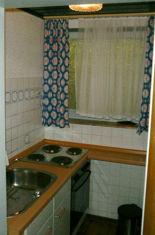Diese Ferienwohnung ist 54 m² groß und befindet sich im Souterrain des Hauses. Sie besitzt eine für 6 Personen vollständig ausgestattete Küche. Vor der Wohnung befindet sich ein teil-überdachter Freisitz.