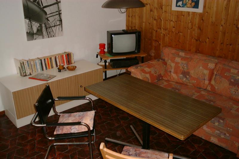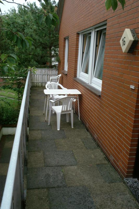 Diese Ferienwohnung befindet sich im Erdgeschoß. Die Küchenzeile mit Herd und Kühlschrank ist eingerichtet für 6 Personen. Vor der Wohnung lädt eine schöner Terasse zum Frühstück ein.